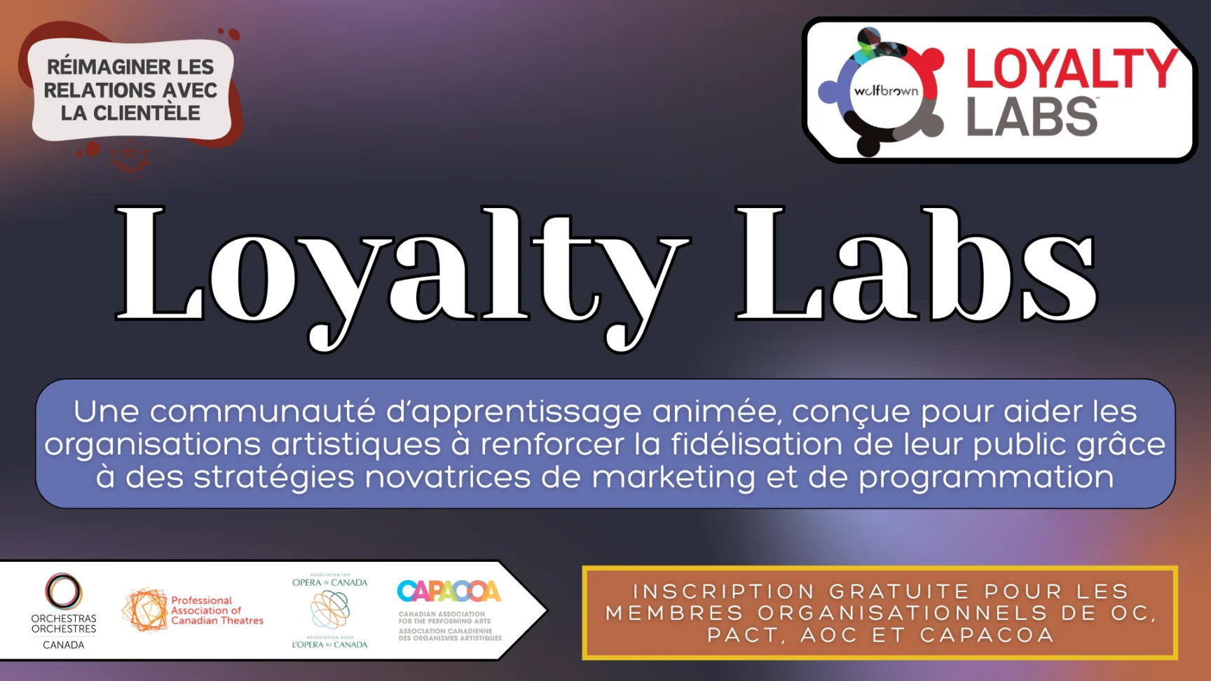 Dans le cadre du projet Réimaginer les relations avec la clientèle, CAPACOA, Orchestres Canada (OC), la Professional Association of Canadian Theatres (PACT) et l’Association pour l’Opéra au Canada (AOC) sont heureuses de s’associer à WolfBrown, une firme américaine de recherche et de consultation, afin d’offrir une participation gratuite au nouveau programme Loyalty Labs à tous les membres organisationnels de ces associations de services aux arts.